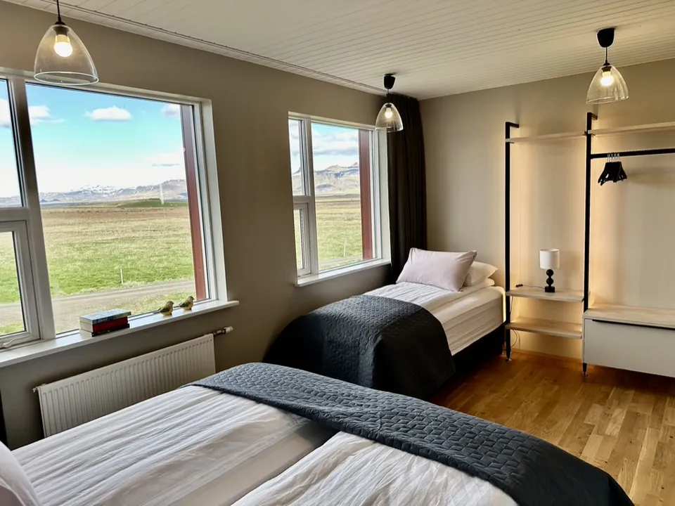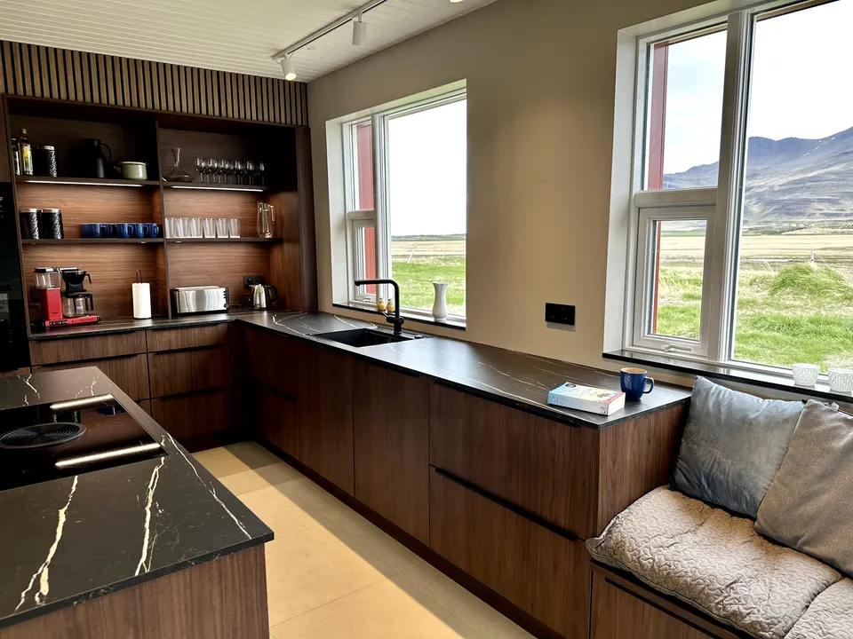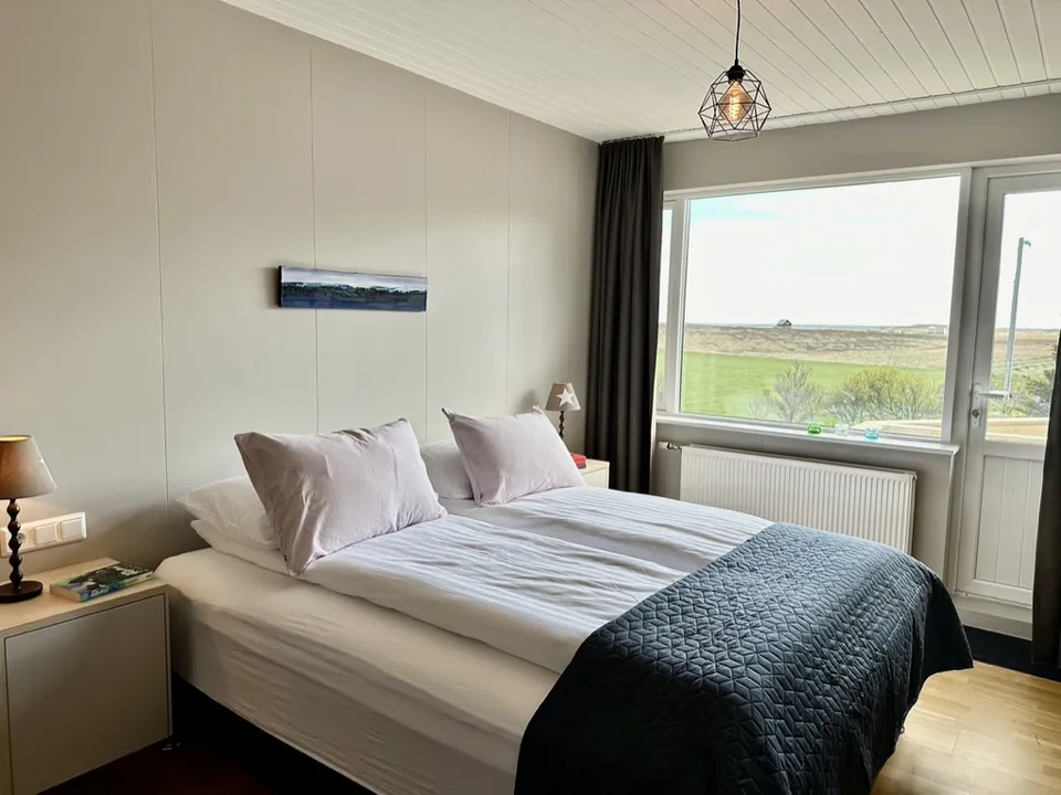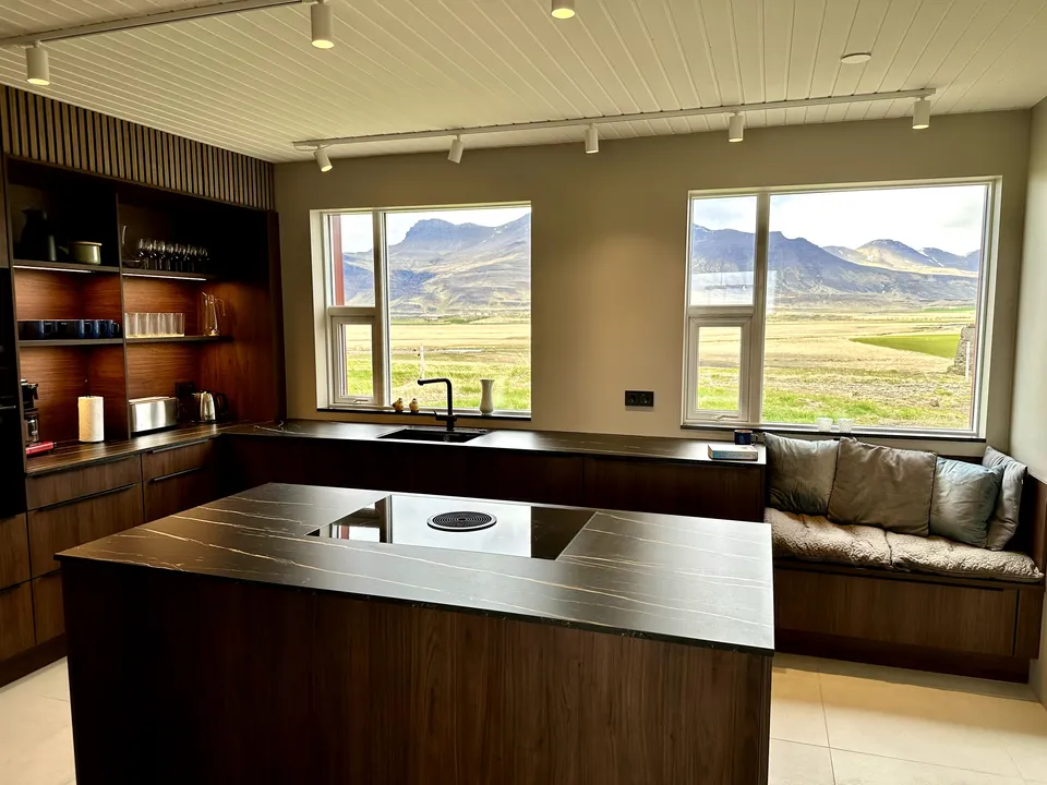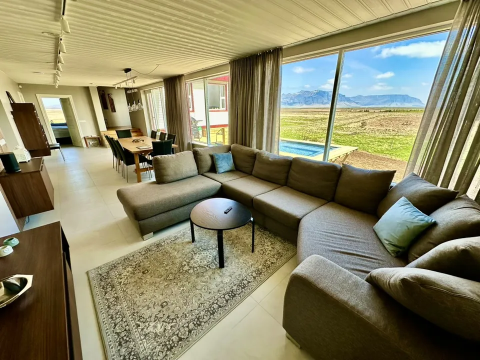 Hrossholt has an open kitchen with a large walk around worktop and mountain views from the kitchen window. The kitchen is very spacious and ideal for family and friends preparing a good meal together. In the kitchen there is high quality white ware and equipment for cooking. The dining room and living room are connected and have large windows and amazing views to Eldborg Crater. The bedrooms are cozy and comfortable with new beds and beautiful views. Both bathrooms are spacious with walk in showers and warm towel racks. One of the bathrooms has a washing machine and dryer.