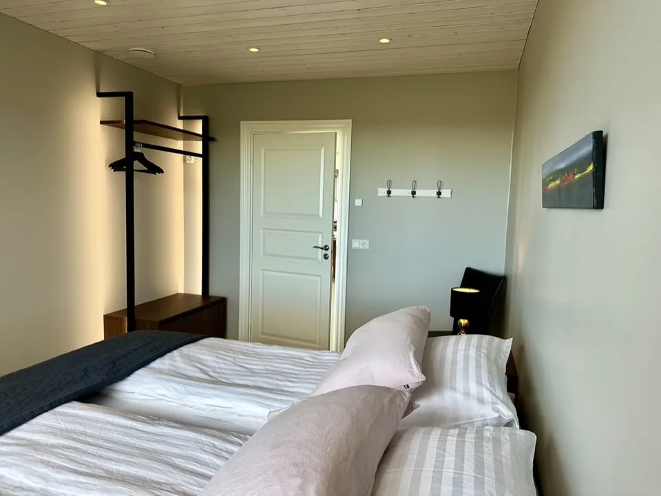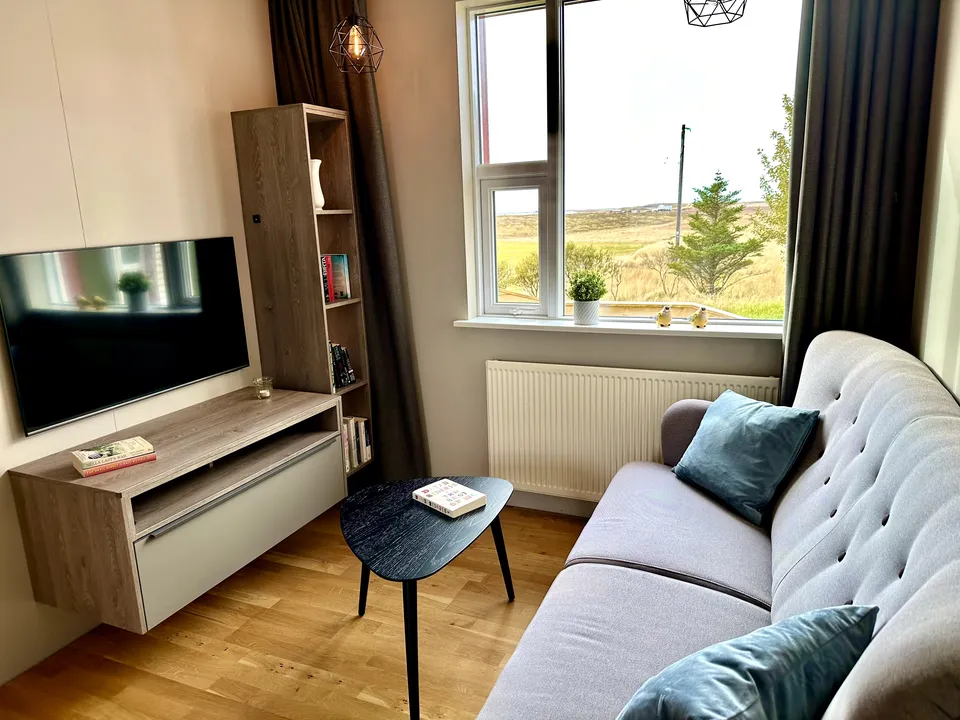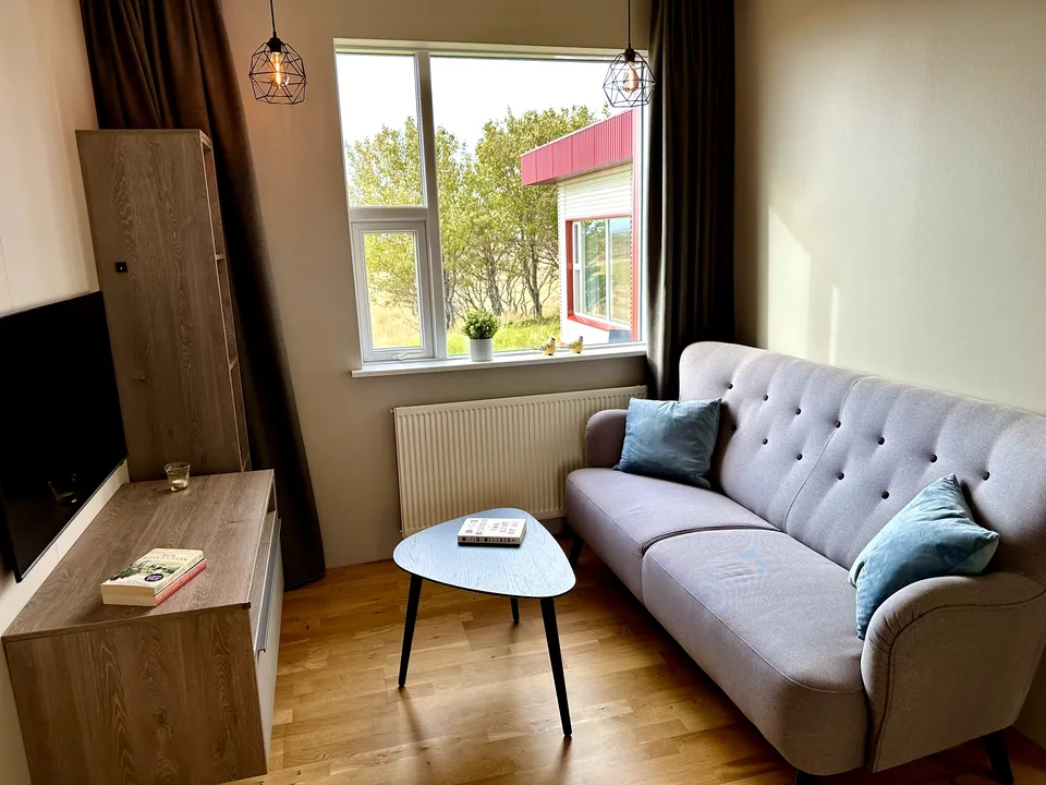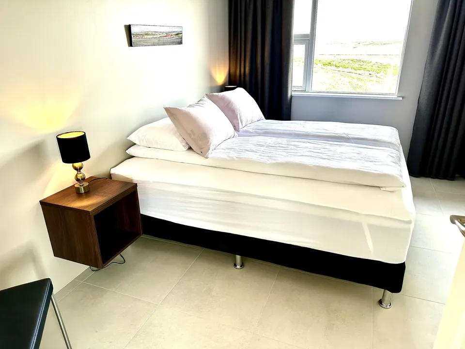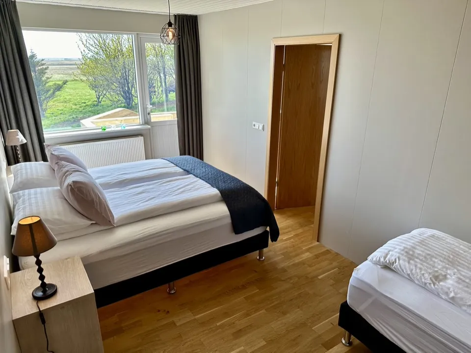 Hrossholt has an open kitchen with a large walk around worktop and mountain views from the kitchen window. The kitchen is very spacious and ideal for family and friends preparing a good meal together. In the kitchen there is high quality white ware and equipment for cooking. The dining room and living room are connected and have large windows and amazing views to Eldborg Crater. The bedrooms are cozy and comfortable with new beds and beautiful views. Both bathrooms are spacious with walk in showers and warm towel racks. One of the bathrooms has a washing machine and dryer.